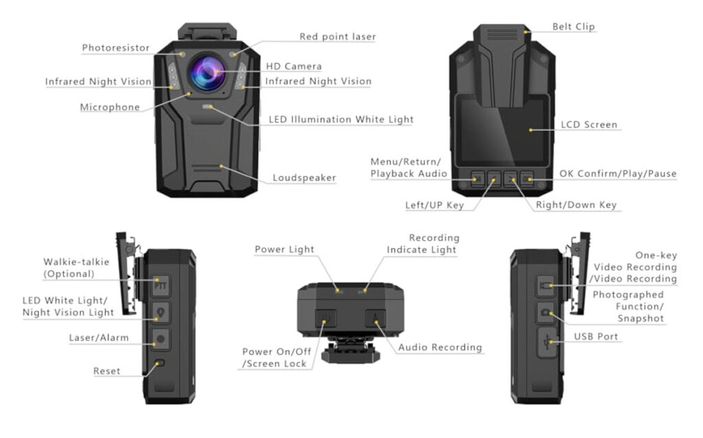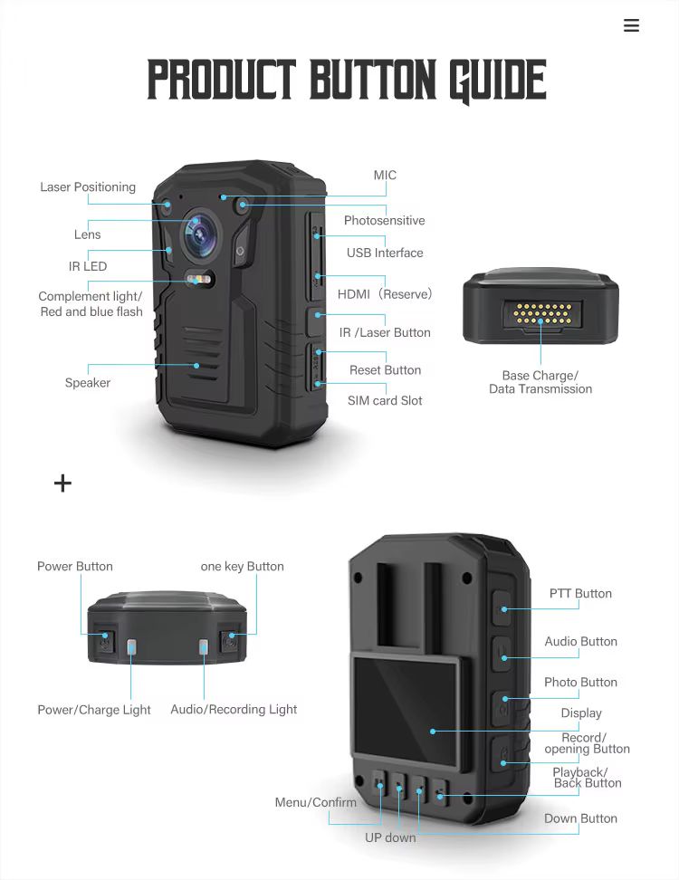Body Worn Camera cuenta con una pantalla LCD digital de 2,0" que permite a los usuarios reproducir instantáneamente las imágenes capturadas y ver los archivos de audio y vídeo grabados. IP66 y resistente a caídas y resistente a la corrosión El nivel de impermeabilidad es de hasta IP66, lo que significa que la cámara corporal es lo suficientemente fuerte como para soportar las inclimas inmertes incluso en tormentas y nieve. El material PP/ABS resistente a la llama asegura.